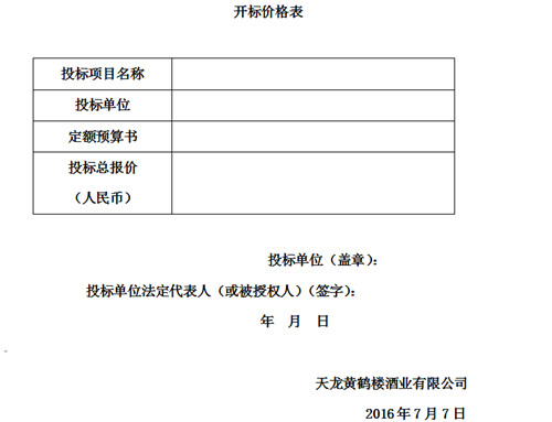 六、開標(biāo)、評(píng)標(biāo)、定標(biāo):由天龍黃鶴樓酒業(yè)有限公司另行通知。