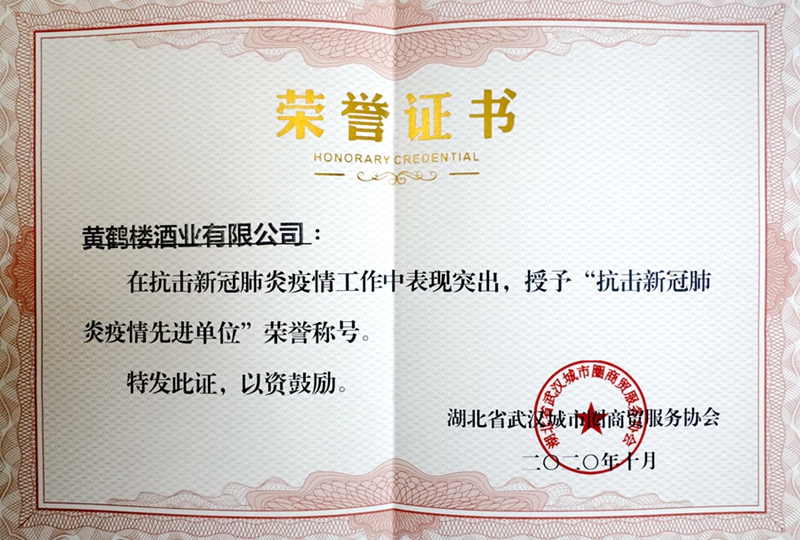 近日,湖北省武漢城市圈商貿(mào)服務(wù)協(xié)會(huì)為參與抗擊新冠肺炎疫情具有杰出貢獻(xiàn)的先進(jìn)單位和個(gè)人進(jìn)行頒獎(jiǎng),黃鶴樓酒業(yè)獲“抗擊新冠肺炎疫情先進(jìn)單位”榮譽(yù)稱(chēng)號(hào)。