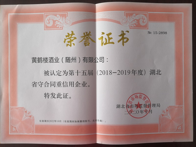 11月4日,隨州市市場監(jiān)督管理局授予黃鶴樓酒業(yè)(隨州)有限公司隨州市第十屆“守合同重信用”企業(yè)榮譽稱號并發(fā)放證書,代授湖北省第十五屆“守合同重信用”企業(yè)榮譽證書。