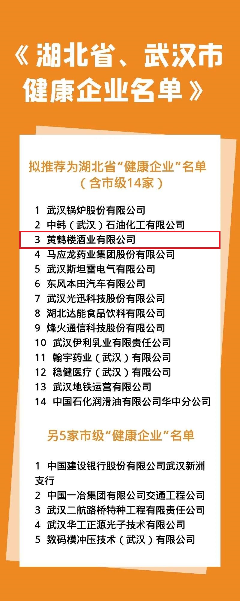 近日,2020年武漢市“健康企業(yè)”創(chuàng)建和評(píng)審結(jié)果揭曉。黃鶴樓酒業(yè)獲評(píng)市級(jí)“健康企業(yè)”榮譽(yù),并將被推薦參評(píng)湖北省“健康企業(yè)”。
