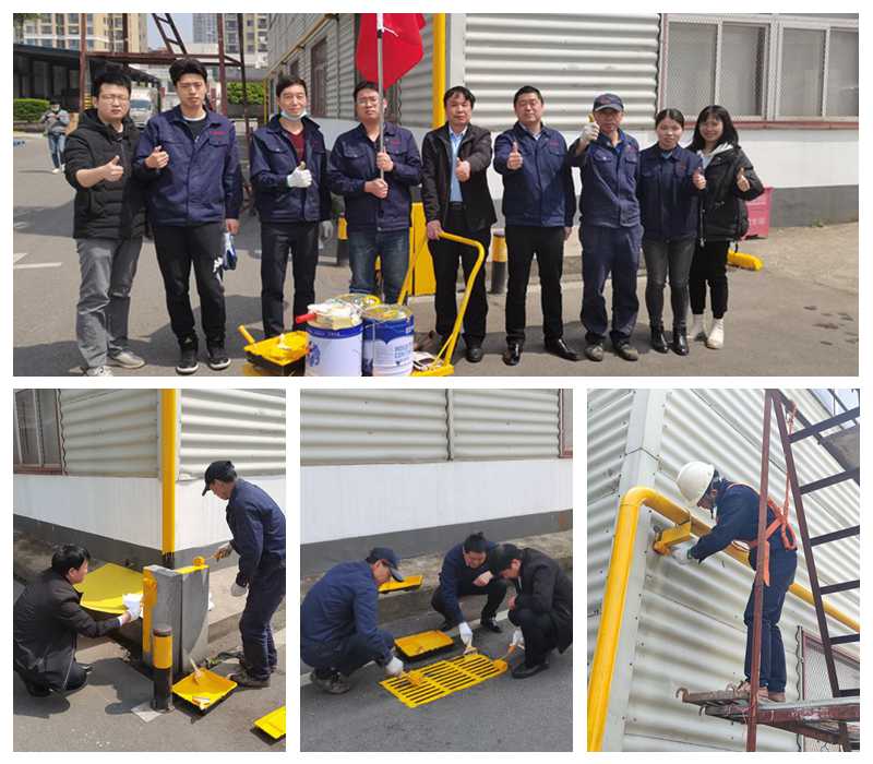 活動中,各黨員、積極分子化身“油漆工”,對武漢廠區(qū)天然氣管道、雨水井蓋及標(biāo)識進(jìn)行了重新噴漆。深入基層、服務(wù)基層,在做好防護(hù)的前提下,大家輕裝上陣,紛紛投入井蓋刷漆、登高刷漆、地面防護(hù)等作業(yè)任務(wù)。經(jīng)過幾個小時的努力,廠區(qū)天然氣管道及雨水井蓋煥然一新,設(shè)施標(biāo)識更加醒目。