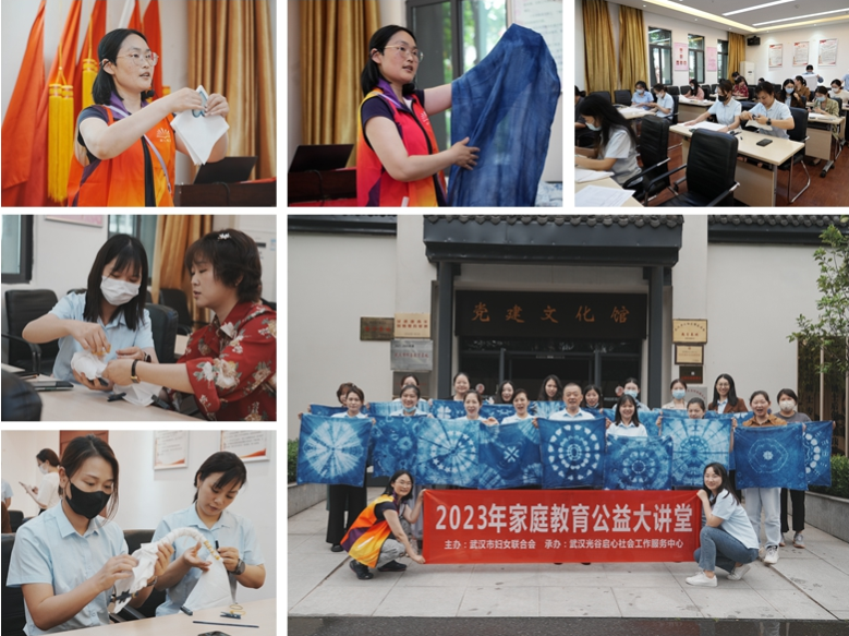 本次活動邀請武漢光谷啟心社會工作服務(wù)中心老師進(jìn)行指導(dǎo)?;顒娱_始,老師向大家介紹了扎染的歷史與傳承,隨后老師現(xiàn)場演示幾種扎染花紋的扎節(jié)方式以及操作技巧,扎節(jié)時松、緊、疏、密的不同,使得扎染成品花色圖案千差萬別,絢麗多姿。隨后,參會人員紛紛發(fā)揮著自己的想象力創(chuàng)造力,扎染出屬于自己獨(dú)一無二的花紋。