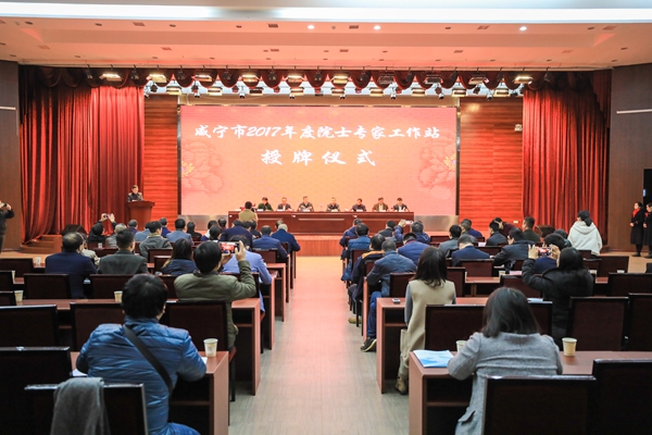 儀式上,余軍、周勇為天龍黃鶴樓酒業(yè)咸寧有限公司、咸寧南玻節(jié)能玻璃有限公司等11家企業(yè)“院士專家工作站”授牌。