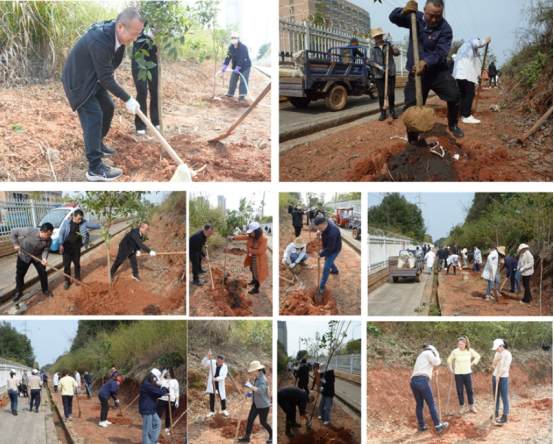活動中,大家利用鋤頭、鐵鍬等工具,挖坑、放樹苗、填土、澆水、培土,相互配合、齊心協力,經過不斷努力,將近百棵樹苗成功栽種,一株株桂花樹幼苗挺拔于春風中,傳遞著黃鶴樓酒的品牌生機與活力。