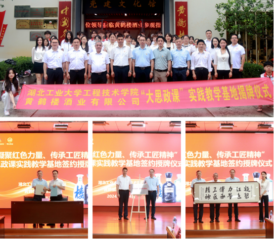 6月24日,湖北工業(yè)大學工程技術學院與黃鶴樓酒業(yè)舉行“大思政課”實踐教學基地簽約及授牌儀式。湖北工業(yè)大學工程技術學院黨委書記朱愛軍、副院長姜偉,黃鶴樓酒業(yè)黨委委員、技術質量中心總監(jiān)李良,工會主席、黨工團中心總監(jiān)張瑞,人力資源中心總監(jiān)張佳出席活動。