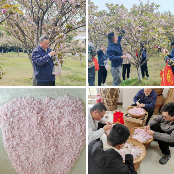 活動(dòng)現(xiàn)場,技術(shù)質(zhì)量中心相關(guān)人員詳細(xì)介紹了花瓣分揀標(biāo)準(zhǔn)。隨后,10余名黨員進(jìn)行分組作業(yè),精心采摘,嚴(yán)格篩選出符合釀酒標(biāo)準(zhǔn)的優(yōu)質(zhì)花瓣,把好源頭原料關(guān),共采集10余斤優(yōu)質(zhì)櫻瓣。